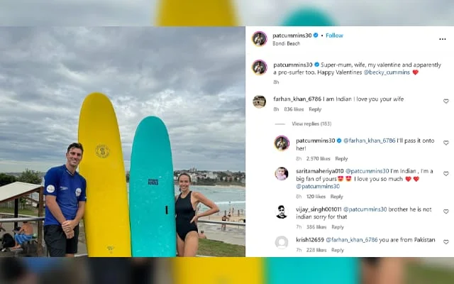 However, an India fan confessed his love for Pat Cummins’ wife in a comment on one of the pictures. Meanwhile, the right-arm pacer comes up with a heroic answer, showing he would pass on the message to his wife to respond to the comment. The reply of the Aussie star to the Indian fan has gone viral on social media and has been loved by the fans for the respect he has given to India.
