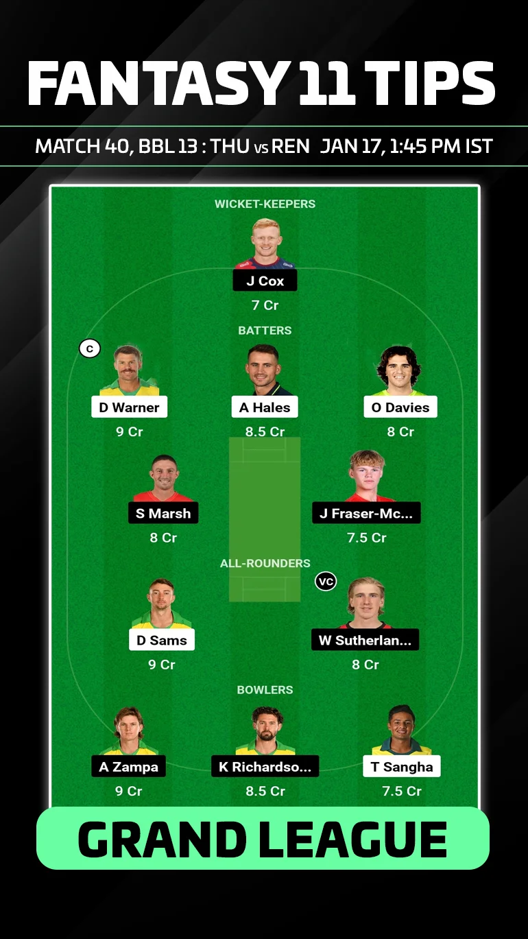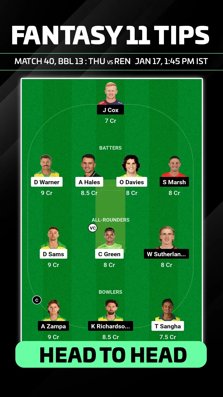 THU vs REN Dream11 Prediction, Fantasy Team, Today’s Playing XI, Head-To-Head Stats, and Injury updates for BBL 2023 Match 40