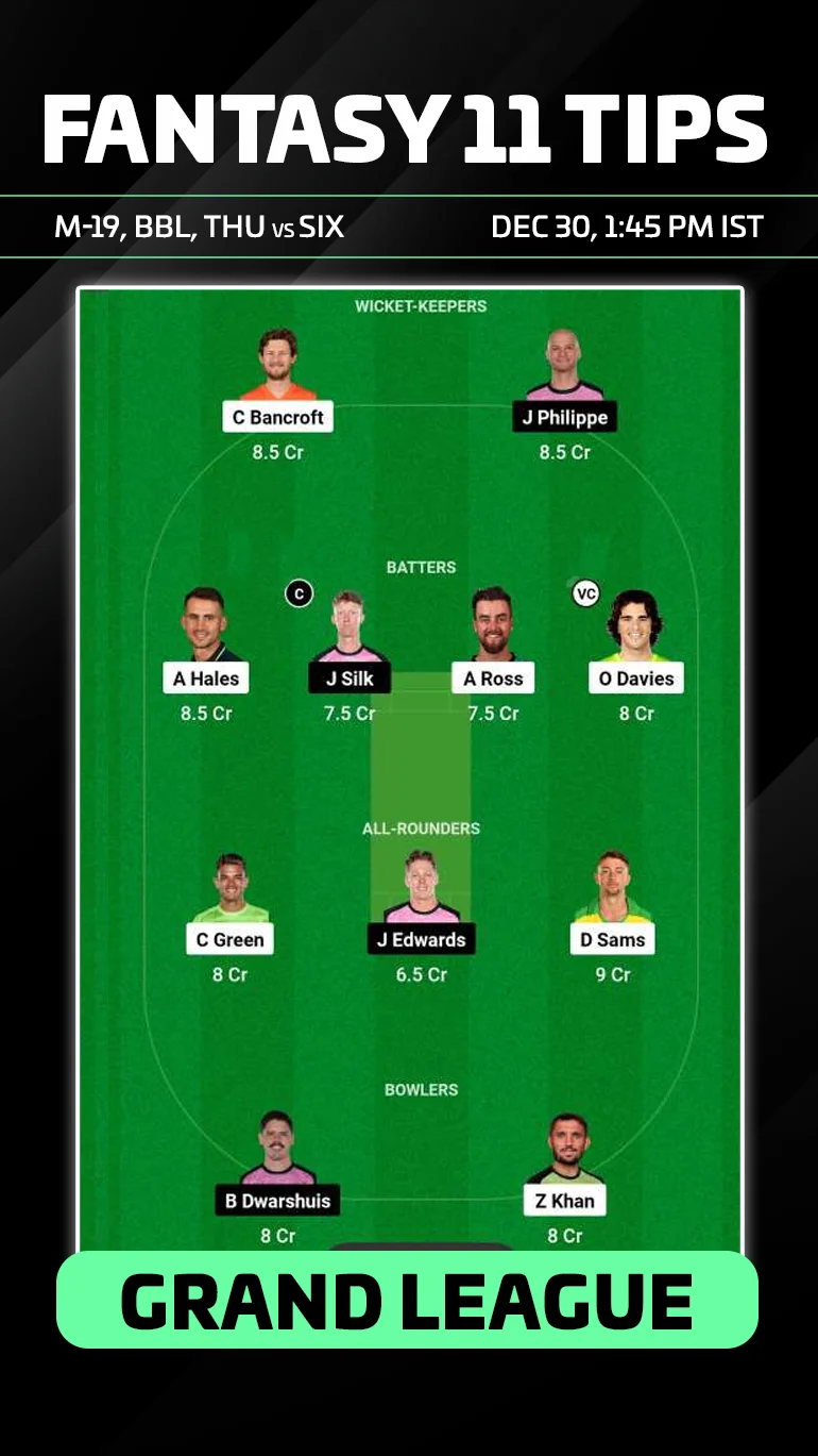 Sydney Thunder (THU): Matthew Gikes (WK), Alex Hales, Oliver Davies, Cameron Bancroft, Alex Ross, Nathan McAndrew, Daniel Sams, Chris Green (C), Zaman Khan, Tanveer Sangha, Liam Hatcher