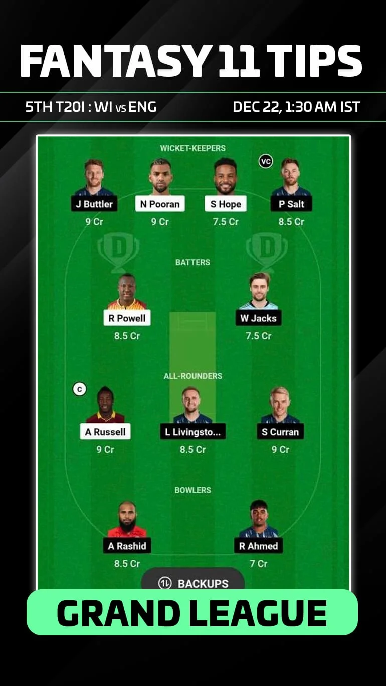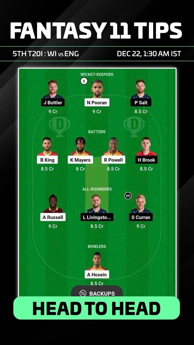WI vs ENG Dream 11 Prediction, Fantasy Team, Today’s Playing XI, Head to Head Stats, and injury updates for England tour of West Indies, 5th T20I